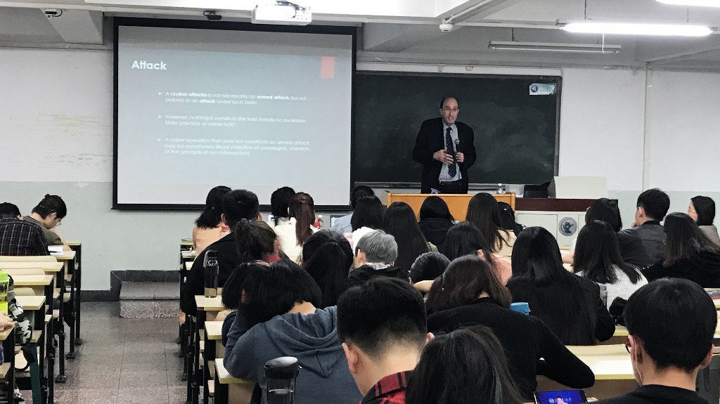 2018年10月18日,米兰国立大学马克·派德拉兹教授在学院南路校区主教303教室作主题为“网络攻击与武力使用:战时法与平时法(Cyber Attack as Use of Force: Jus ad Bellum and Jus in Bello)”的讲座。马克·派德拉兹教授在介绍相关法律概念后,重点阐释对网络攻击可否行使自卫权,重点分析了《联合国宪章》中“武力攻击(armed attack)”、“使用武力(use of force)”等核心概念的界定,探讨了国家行为的归因性以及网络武装冲突中区分原则和比例原则等问题。网络攻击现象的国际法规制引起了学生的浓厚兴趣,学生们积极提问。