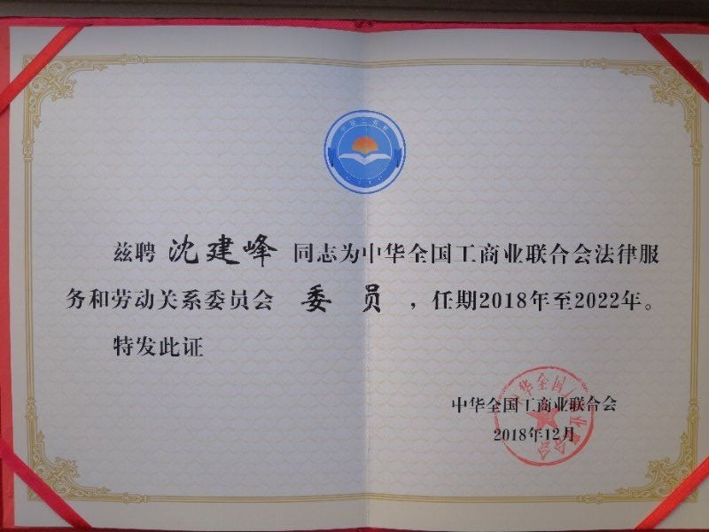 2018年12月25日全国工商联法律服务和劳动关系委员会成立大会在全国工商联大楼举行,中央统战部副部长、全国工商联党组书记、常务副主席徐乐江,全国工商联副主席、党组成员鲁勇等出席会议并为委员颁发聘书,我校沈建峰教授获聘担任该委员会委员。