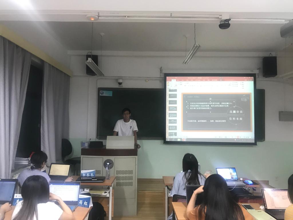 第三位进行汇报的是2016级法律硕士郭冬冬同学。郭冬冬同学从论文介绍写到感悟心得,给同学们带来了满满的干货。在汇报过程中,郭冬冬同学多次强调选题要慎重,要选一个理论中有缺失、制度中不完善、实践中有问题的选题。此外,他提出了论文写作的两条路径,即观点新和资料全,并分析了这两条路各自的优劣之处,针对不同法学基础的同学提出相应建议。最后他从自己的写作经验中总结了文章写作前和案例分析时需要注意的事项,实用性较强,使同学们获益匪浅。接着,评议人杨根同学提出了资料搜集的难题,郭冬冬同学也向其传授了自己的经验。