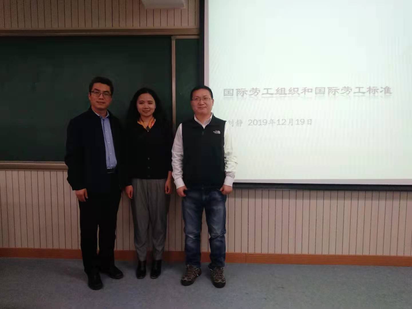 刘静副处长首先对沈建峰教授和李海明副教授的邀请表示感谢,并表示非常高兴也很荣幸有机会和大家一起交流。她谈到由于自身的教育背景是劳动与社会保障法方向,又在工作了多年后有机会去国际劳工组织工作了两年,亲身体验了国际劳工组织的运作方式,有了自己的一些观察和思考,所以此次讲座主要分为三个部分:第一部分是国际劳工组织,第二部分是国际劳工标准,第三部分是选择国际公务员作为职业的问题。