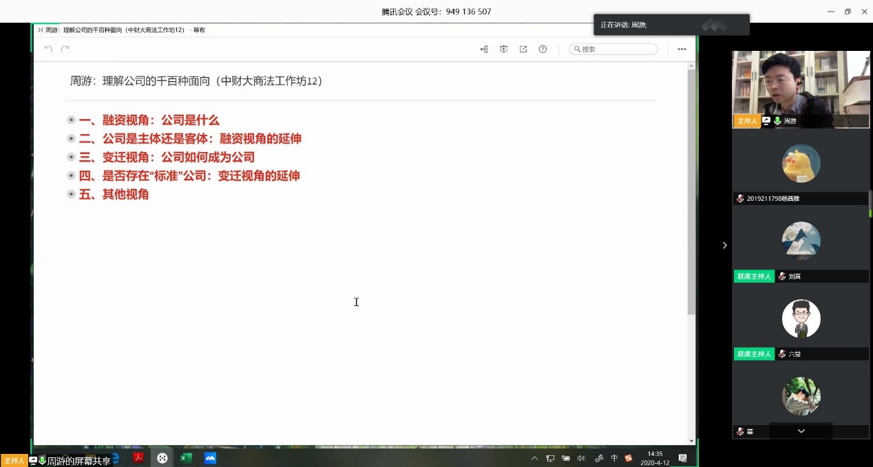 2020年4月12日下午,商法工作坊2020年第4期(总第12期)在直播平台上以线上交流与讨论的方式举行,此次活动主题是研读《公司宪治论》一书。中央民族大学开云kaiyun官网讲师邵六益博士作为特邀嘉宾,开云kaiyun官网周游副教授作为指导老师参与了本次活动。工作坊主要由指导老师引导、发言人展示、成员及其他与会者提问及评价、评议人评议、特邀嘉宾发言、指导老师总结等环节组成。此次线上活动共有60余名校内外师生及业界人士参与讨论。