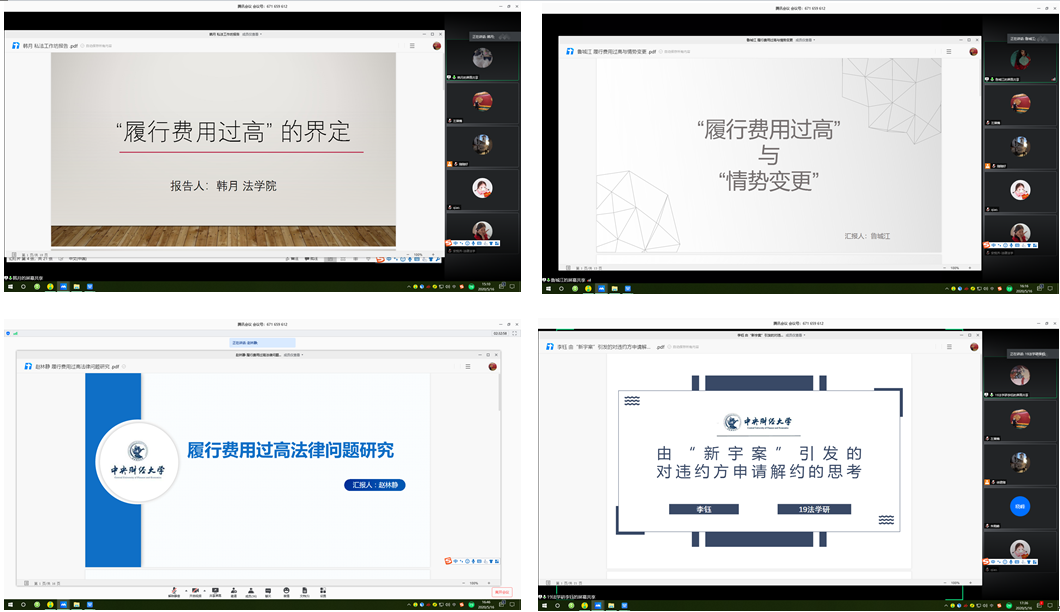 在发言人展示间隙,开云2019级硕士研究生蒋睿、程相宜、张俏和安悦齐分别对四份报告进行了评议。蒋睿指出韩月的报告层次分明,内容详实,比较现实地回应了司法实践中的一些难题,同时对报告的结构提出修改建议。程相宜首先对鲁城江的报告予以肯定,并且分享了自己对情势变更标准的看法,即目前适用情势变更判决的案例很少,可见适用情势变更制度的要求很严格,因此选取债务人利益显著低于成本作为标准对债务人过于有利。此外,程相宜建议在民法典去掉非不可抗力的要件之后,报告中应当对情势变更、履行费用过高和不可抗力的交叉一并予以讨论。张俏在赵林静报告的基础上,对目前履行费用过高比较对象的各种学说进行体系化梳理,并对报告中借鉴最高人民法院关于民间借贷利率的限制性规定,以及合同法解释(二)中确定的明显不合理高价的解释标准,类推适用后得出的当履行费用达到债权人履行利益的130%时认定为过高的结论进行了批判。安悦齐认为李钰的报告论证明晰、说理有据,并指出违约方解除权不应在立法上得以确认,但有必要规定重大事由解除权。