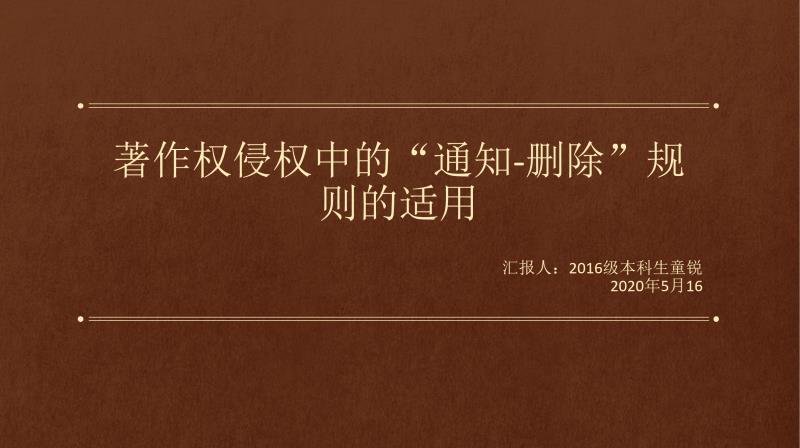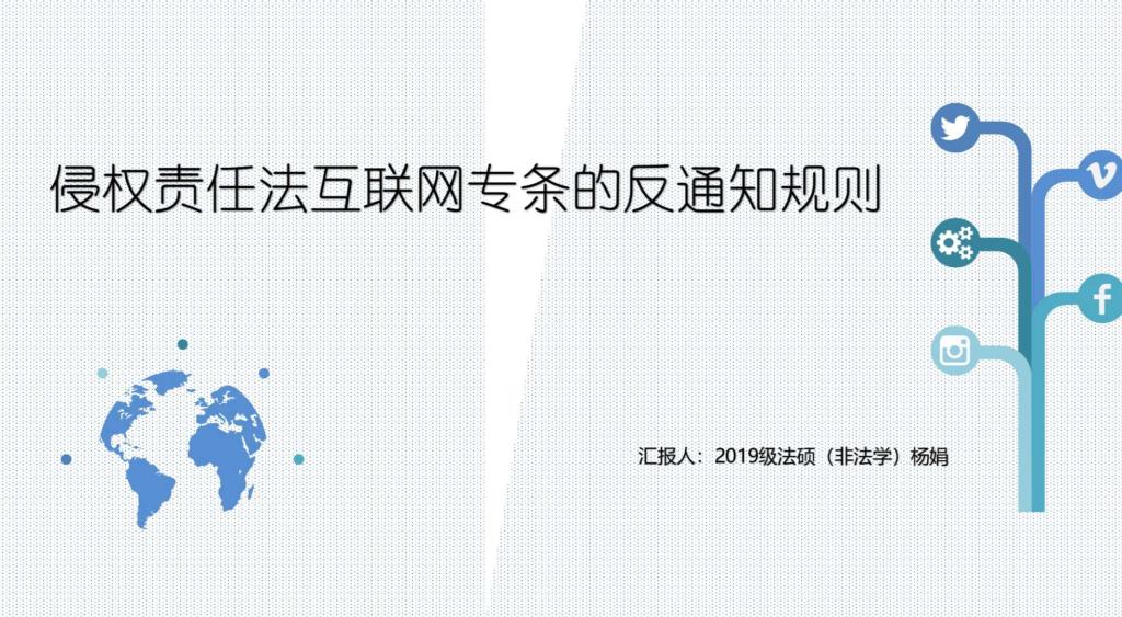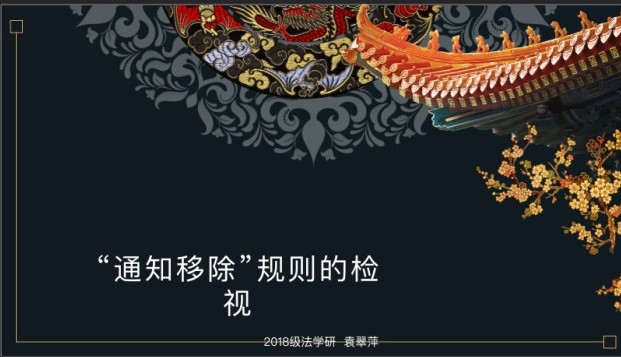 接着,在主报告人分享环节,开云2019级硕士研究生杨雨晴、2016级本科生童锐、2018级本科生袁翠萍、2016级本科生刘斯宇以及2019级硕士研究生杨娟依次分享了各自对通知删除规则的理解及观点。杨雨晴同学以“通知删除规则的诞生与实践困境”为题分别阐述了通知删除规则的产生、基于实证分析的实践困境两个问题,总结了通知删除规则虽在运行实践中产生出较多困境,但较之诉讼,其仍为权利人提供了更为廉价便捷的维权替代方案。童锐同学以“著作权侵权中的‘通知-删除’规则的适用”为题,介绍了通知删除规则的产生及在我国的引入,说明了通知删除规则在著作权侵权中的适用,还提出了完善该规则在实践中运用的建议。袁翠萍同学以“‘通知移除’规则的检视”为题,首先介绍了Jennifer Urban教授和Brianna Schofield教授通知移除规则实证分析的结论,随后对比BruceBoyden教授对此的不同观点,并结合我国学者的分析、欧盟相关政策的实施以及美国通知删除规则的最新发展,详细地阐述了通知删除规则在实践中的运行情况。刘斯宇同学以“‘通知-删除’规则在我国的适用与修正”为题,以“小程序案”与“阿里云案”为例,介绍了对我国通知删除规则在司法实践中的发展。杨娟同学以“侵权责任法互联网专条的反通知规则”为题,在介绍了DMCA中反通知规则之后,结合对《侵权责任法》第36条的理解,提出了该条款可以延伸解释出包含了反通知规则。