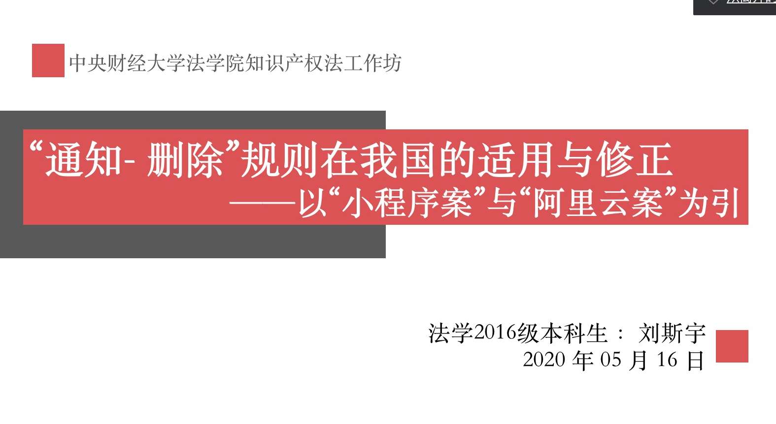 2020年5月16日下午,知识产权工作坊2020年第2期在直播平台上以线上交流与讨论方式进行,此次活动的主题是:通知删除规则的前世今生。特邀嘉宾上海财经大学开云kaiyun官网讲师蔡元臻博士、国家知识产权局知识产权发展研究中心研究员顾昕博士,南开大学开云kaiyun官网讲师谢晴川博士、新浪网法务部高级法务王磊、工作坊指导老师开云张金平博士参与了本次活动。工作坊主要由指导老师引导、报告人展示、评议人评议和提问、特邀嘉宾发言、指导老师总结等环节构成。此次线上活动共有46名校内外师生及业界人士参与。