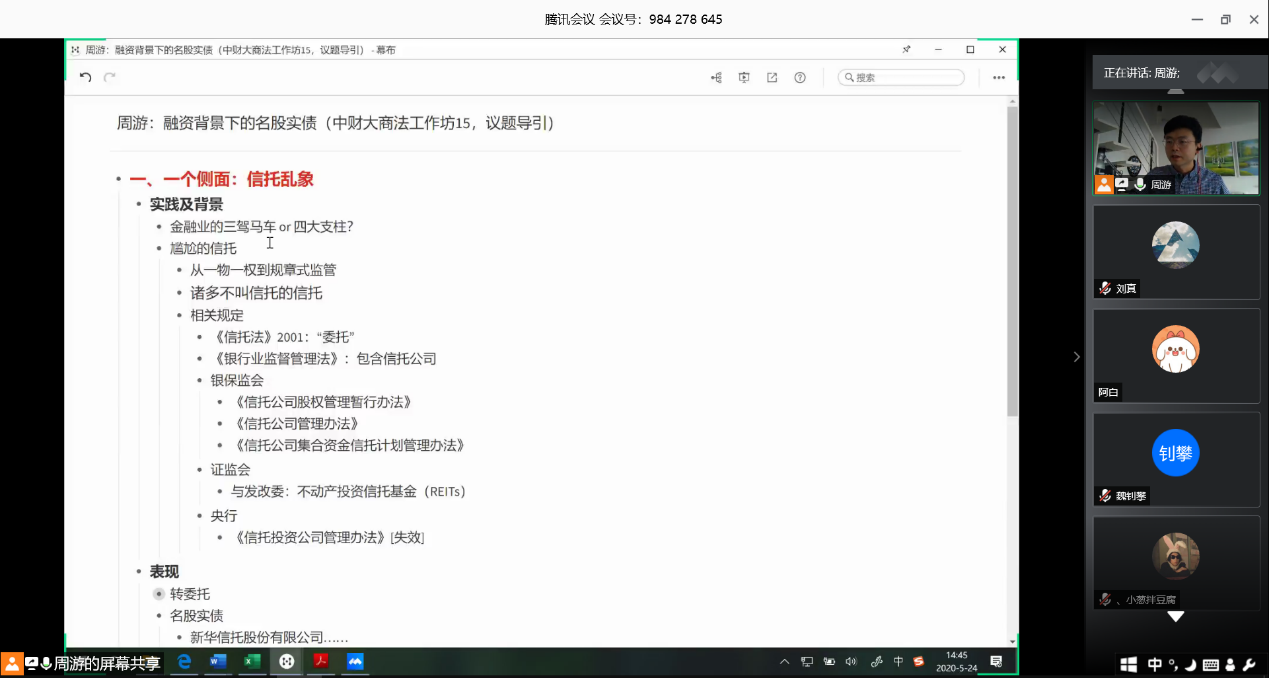 2020年5月24日下午,开云kaiyun官网商法学研究工作坊2020年第7期(总第15期)在直播平台以线上交流与讨论的方式如期举行。本次活动议题为名股实债。中国政法大学民商经济开云kaiyun官网讲师冀放博士、澳门科技大学开云kaiyun官网助理教授彭运朋博士作为本期工作坊的特邀嘉宾,开云周游副教授作为指导老师参与了本次活动。工作坊主要由指导老师引导、发言人展示、成员及其他与会者提问及评价、评议人评议、特邀嘉宾发言、指导老师总结等环节组成。此次线上活动共有60余名校内外师生及业界人士参与讨论。