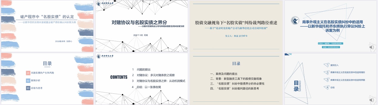 在发言人展示环节中,开云2019级研究生臧舒雅以及2017级本科生周嵩、林晟,还有2018级本科生甘舒心分享了各自的研究体会。甘舒心同学以新华信托诉港城置业破产债权确认纠纷案为例,从内部关系和外部关系的角度出发,探讨破产程序中“名股实债”性质的认定问题,认为应当注重外部关系分析来平衡各方权益,并提出了对投资方利益保护的思考。周嵩同学以赣州市世瑞钨业有限公司与钟易良借款合同纠纷案为切入点,就对赌协议与名股实债之界分进行了介绍,并对对赌协议与名股实债共同的股权外观进行了分析,通过从交易动机、对赌条款、交易模式三方面的对比,得出对赌协议与名股实债应当是两种并行的投融资模式的结论。林晟同学以新华信托诉北京时光案为例,结合股债交融的商业实践背景,探讨“名股实债”纠纷裁判中股债界分之非必要性,并从认定当事人权利义务之命题来解析,以强调司法的利益衡量功能。臧舒雅同学以乔东辉执行异议之诉为例,讲述了商事外观主义在名股实债纠纷中的适用情形,并且进一步分析了构成要件以及利益规制等适用限制。