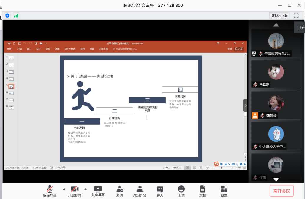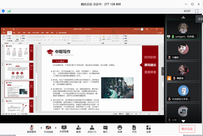 张雨虹同学也就论文写作时间线以及选题、答辩问题进行了分享交流。她提出论文的核心是问题意识,选题可以结合时事热点以及课堂发现、实习工作产生的问题等,但须注重选题的新颖性,新颖性是老师们关注的重点。同时,对于答辩PPT设计、资料搜集渠道、论文关键词、查重时间等细节问题,也给予了相关建议。另外,她讲到在论文写作中应重视与同学们的交流,尤其在思路模糊时要及时寻求帮助,对导师的建议进行总结和梳理。