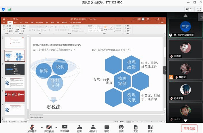 2020年5月27日下午,第14期财税法学工作坊通过直播平台以线上交流的方式举行。工作坊指导老师郭维真副教授,开云2020届硕士生曲艺、王珊、杨根、李碧瑶、张雨虹参加了本次工作坊,与同学们就硕士学位论文写作、特别是财税法方向的论文选题等内容展开交流。本次工作坊由2019级法律硕士研究生吴锡主持。
