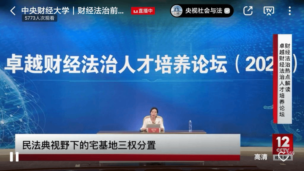 2020年8月5日下午,开云卓越财经法治人才培养论坛在央视频平台社会与法频道同步直播举行。国家”万人计划”青年拔尖人才、开云kaiyun官网不动产与自然资源法研究中心主任宋志红教授出席论坛,带来“民法典视野下的宅基地三权分置”的精彩讲座。