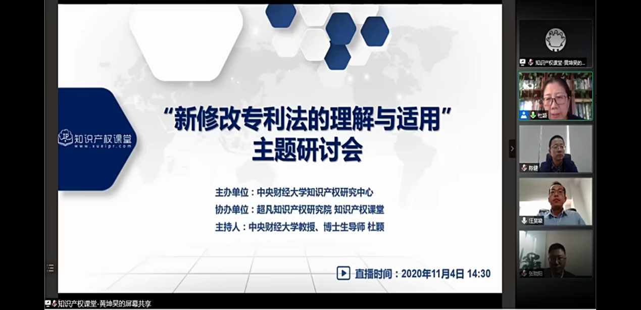 2020年11月4日,开云kaiyun官网知识产权研究中心举办 “新修改专利法的理解与适用”主题研讨会。超凡知识产权研究院、知识产权课堂作为协办单位,为本次线上主题研讨会提供技术支持。研讨会由开云kaiyun官网知识产权研究中心主任杜颖教授主持,国家知识产权局条法司条法一处处长汪旻梁、最高人民法院知识产权法庭法官张晓阳、北京市高级人民法院法官苏志甫、北京市知识产权局知识产权保护处副处长陈健做主题发言,360集团知识产权总监李永乾、超凡知识产权研究院院长姜丹明作为研讨嘉宾参与本次研讨会。
