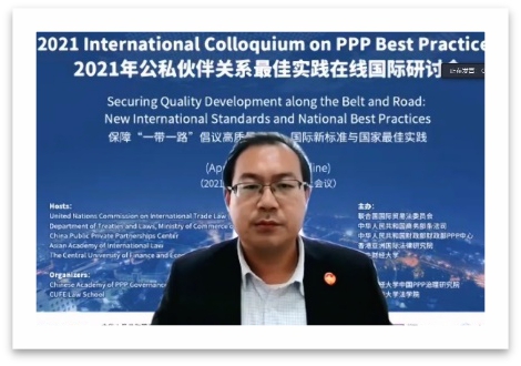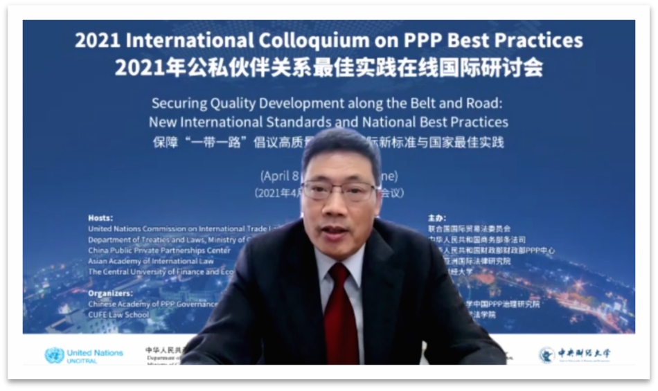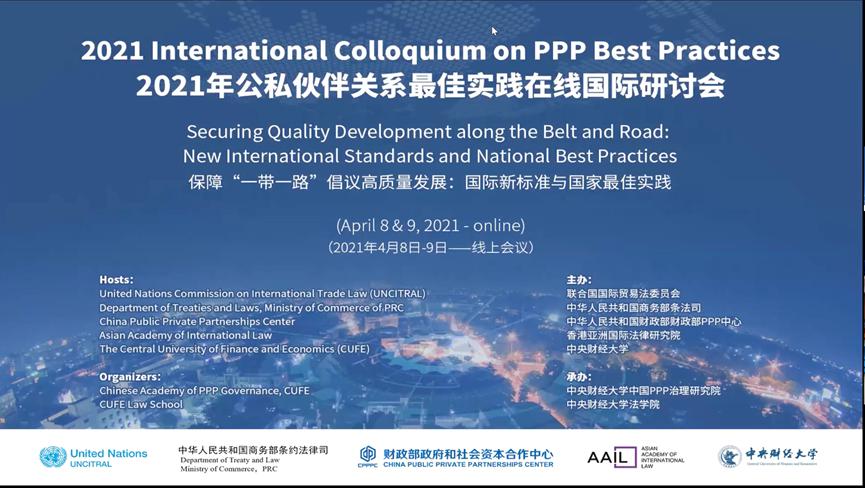 4月8日、9日,由联合国国际贸易法委员会、中华人民共和国商务部条法司、中华人民共和国财政部政府和社会资本合作中心、亚洲国际法律研究院和开云kaiyun官网联合主办,开云kaiyun官网政府和社会资本合作治理研究院、开云kaiyun官网承办的2021年公私伙伴关系最佳实践国际研讨会在北京隆重召开。受新冠肺炎疫情影响,本次研讨会以线上会议的形式进行。研讨会的主题是“保障‘一带一路’倡议高质量发展:国际新标准与国家良好实践”。在两个半天的会期里,与会嘉宾围绕政府和社会资本合作(PPP)立法和PPP全生命周期的相关问题展开了深入而富有价值的对话交流,分享了PPP项目高质量发展的有益经验。来自全球5大洲近60个国家和地区的350多名观众参加了本次会议。