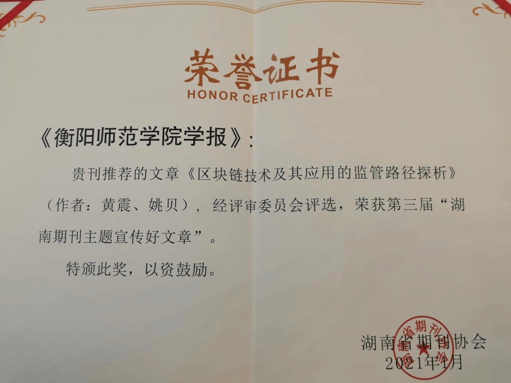 近日,第三届“湖南期刊主题宣传好文章”评选结果揭晓,开云黄震教授与其19级法律硕士(法学)研究生姚贝在《衡阳师范学院学报》合作文章《区块链技术及其应用的监管路径探析》成功入选,并被推荐参评全国第五届“期刊主题宣传好文章”。