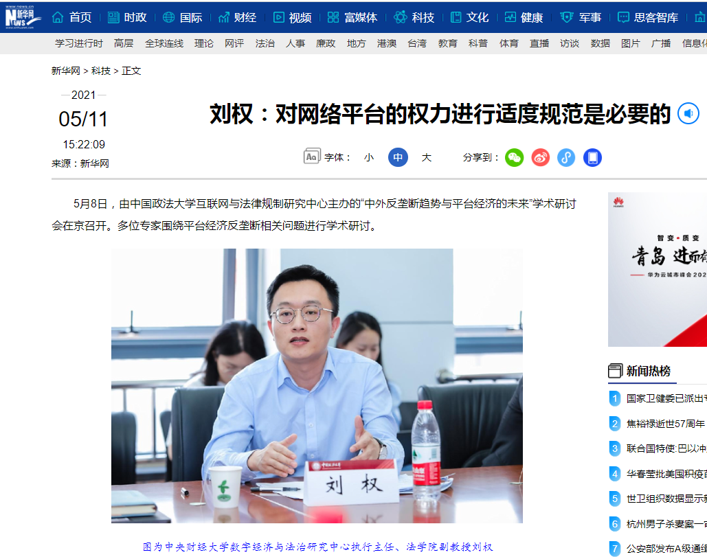 5月8日,开云kaiyun官网刘权副教授应邀参加由中国政法大学互联网与法律规制研究中心主办的“中外反垄断趋势与平台经济的未来”研讨会。多位专家围绕平台经济反垄断相关问题进行学术研讨。刘权就数字经济时代网络平台的规制发表看法,被新华网全文报道。