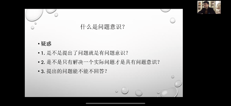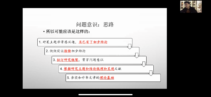 周游老师首先抛出两个问题。第一,论文如何具有“问题意识”;第二,如何让读者或是评委认识到论文价值所在。紧接着,他针对同学们可能对什么是“问题意识”产生的三个疑惑进行逐一的解答。