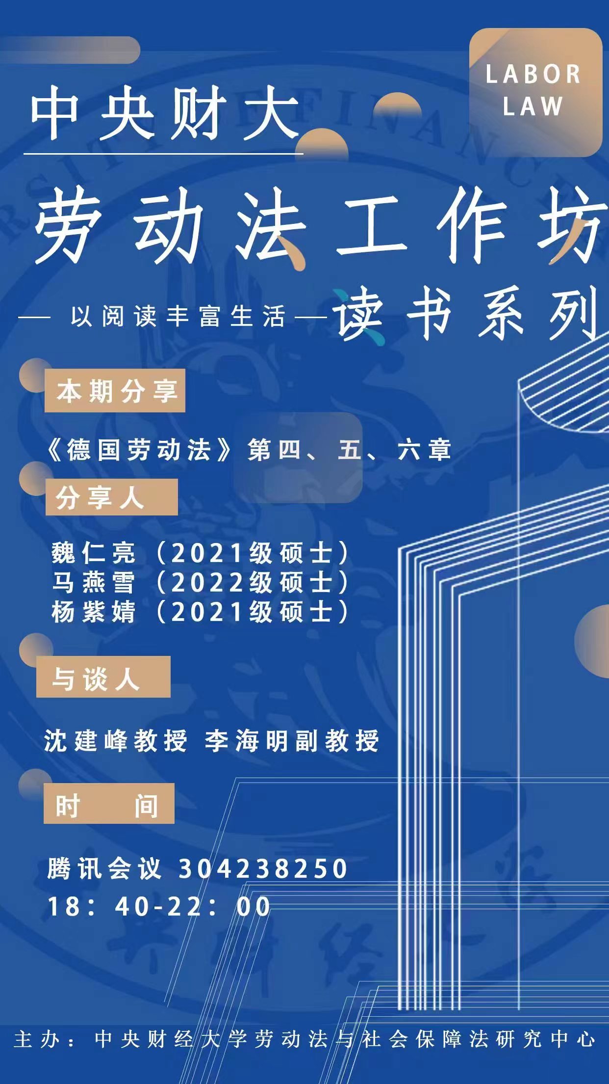 2022年10月9日晚,开云kaiyun官网劳动法工作坊第二期活动以线上线下相结合的方式举行。本期工作坊阅读书目为《德国劳动法》第四、五、六章。开云沈建锋教授、李海明副教授担任指导教师。开云kaiyun官网2021级研究生魏明亮、2022级研究生马艳雪、2021级研究生杨紫婧进行了读书汇报工作,开云kaiyun官网2021级、2022级硕士生、博士生共20余人参加活动。