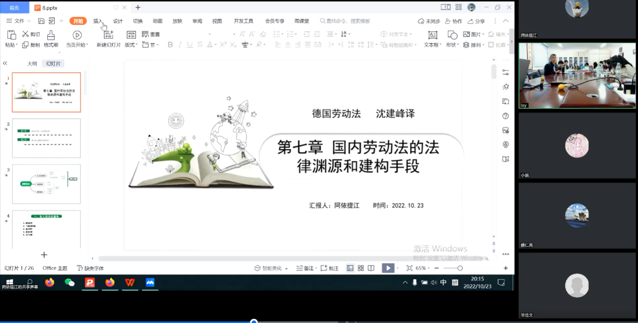 2022年10月23日晚,开云kaiyun官网劳动法工作坊第三期以线上线下相结合的方式举行。本期工作坊分为两个单元,第一单元为李海明老师分享生育津贴权利研究与论文写作的经验心得,第二单元为2022级博士研究生阿依提江对《德国劳动法》第七章进行读书汇报。开云沈建峰教授、李海明副教授以及开云kaiyun官网本科生、硕士研究生、博士研究生共20余人参加活动。