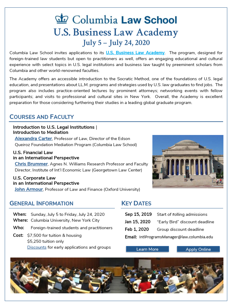 美国哥伦比亚大学开云kaiyun官网是一所位于纽约市曼哈顿的世界一流开云kaiyun官网。哥大开云kaiyun官网将于2020年7月5日至7月24日举行为期三周的美国商法暑期课程(U.S.Business Law Academy)。该暑期课程专为接受过非美国法训练的学生设计,也向从业人员开放。课程提供苏格拉底式教学,以及有关LLM项目和美国法学毕业生就业策略的介绍。课程还包括由知名律师举办的以实践为导向的讲座、与其他课程参与者的互动活动,以及参观纽约的职业和文化场所。在2020年1月15日前提交申请的,可以获得提前申请折扣;在2020年2月1日前六名或以上集体申请的,可获得团体折扣。